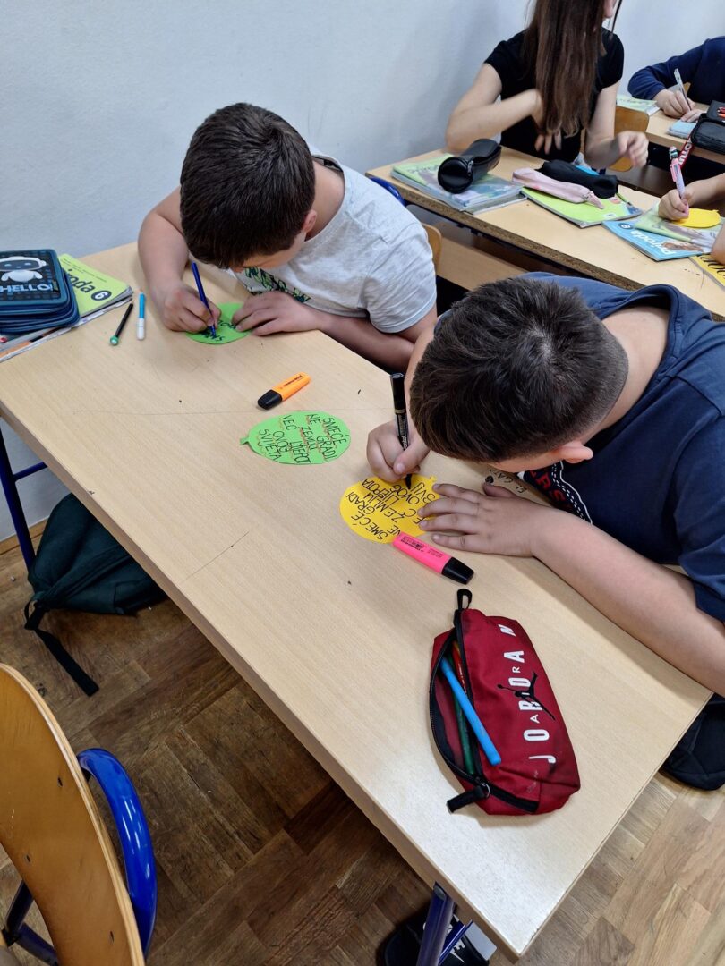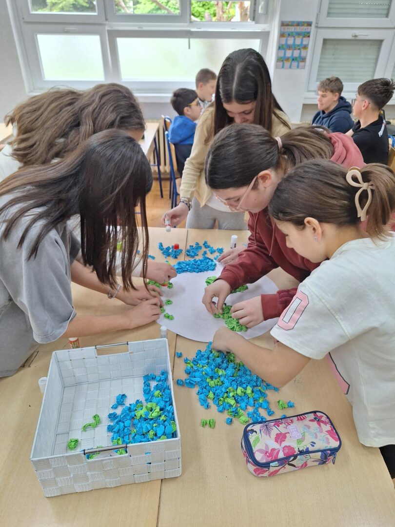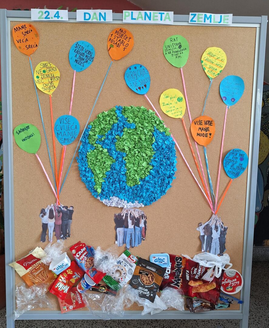 Povodom Dana planeta Zemlje, koji se svake godine obilježava 22. travnja, učenici naše škole su pokazali koliko im je stalo do očuvanja našeg jedinog doma. Kroz timski rad i veselu atmosferu, učenici 6.a, 6.b i 6.c razreda na satu prirode izradili su kreativan pano posvećen očuvanju našeg planeta. Cilj ove aktivnosti bio je osvijestiti važnost očuvanja okoliša, s posebnim naglaskom na osobnu odgovornost. Često mislimo da su ekološki problemi preveliki za nas, no istina je da čuvanje okoliša polazi od pojedinca. Svaki ugašeni prekidač, svaka pravilno odložena boca i svaka vrećica koju nismo bacili u prirodu, naš je osobni doprinos zdravijoj Zemlji.