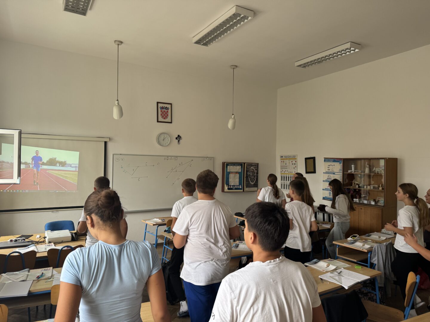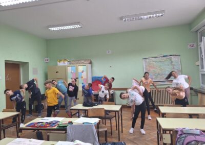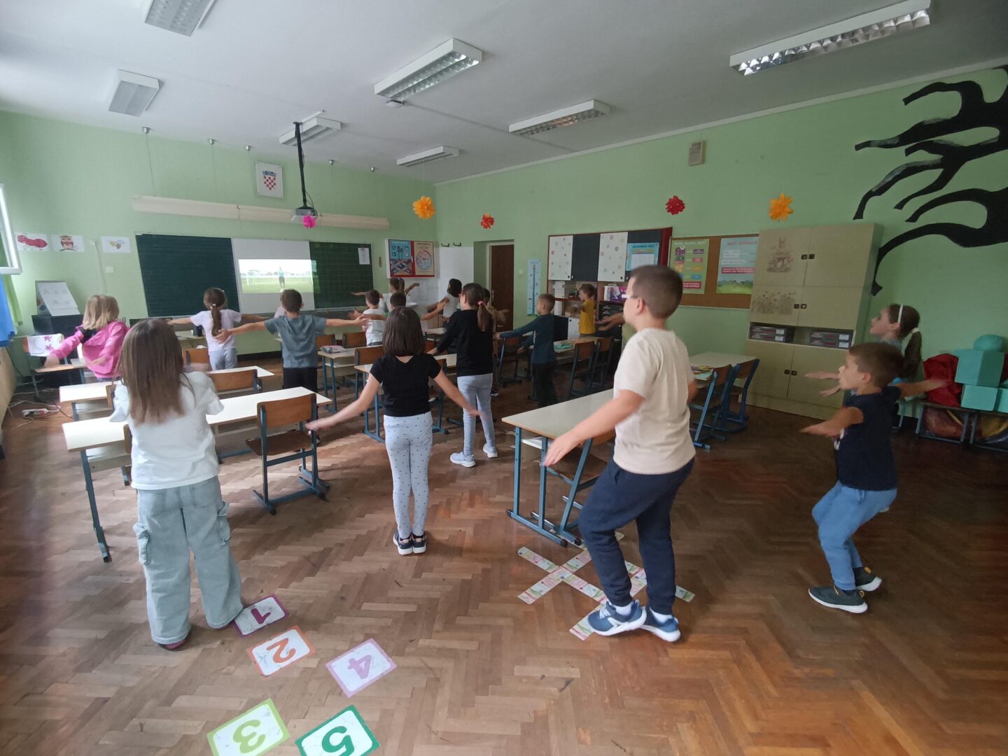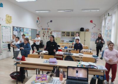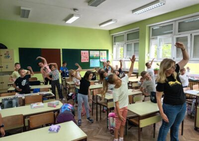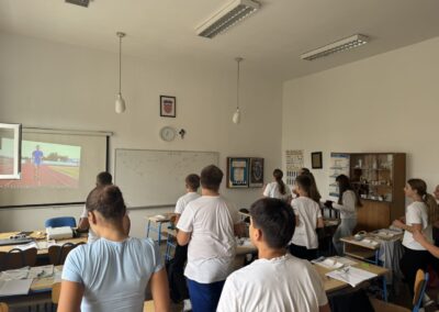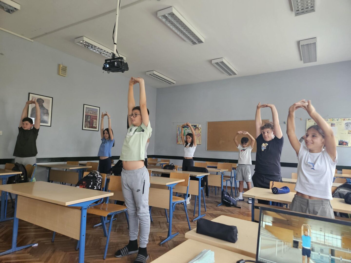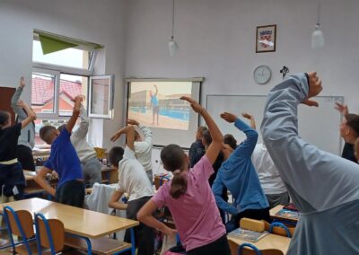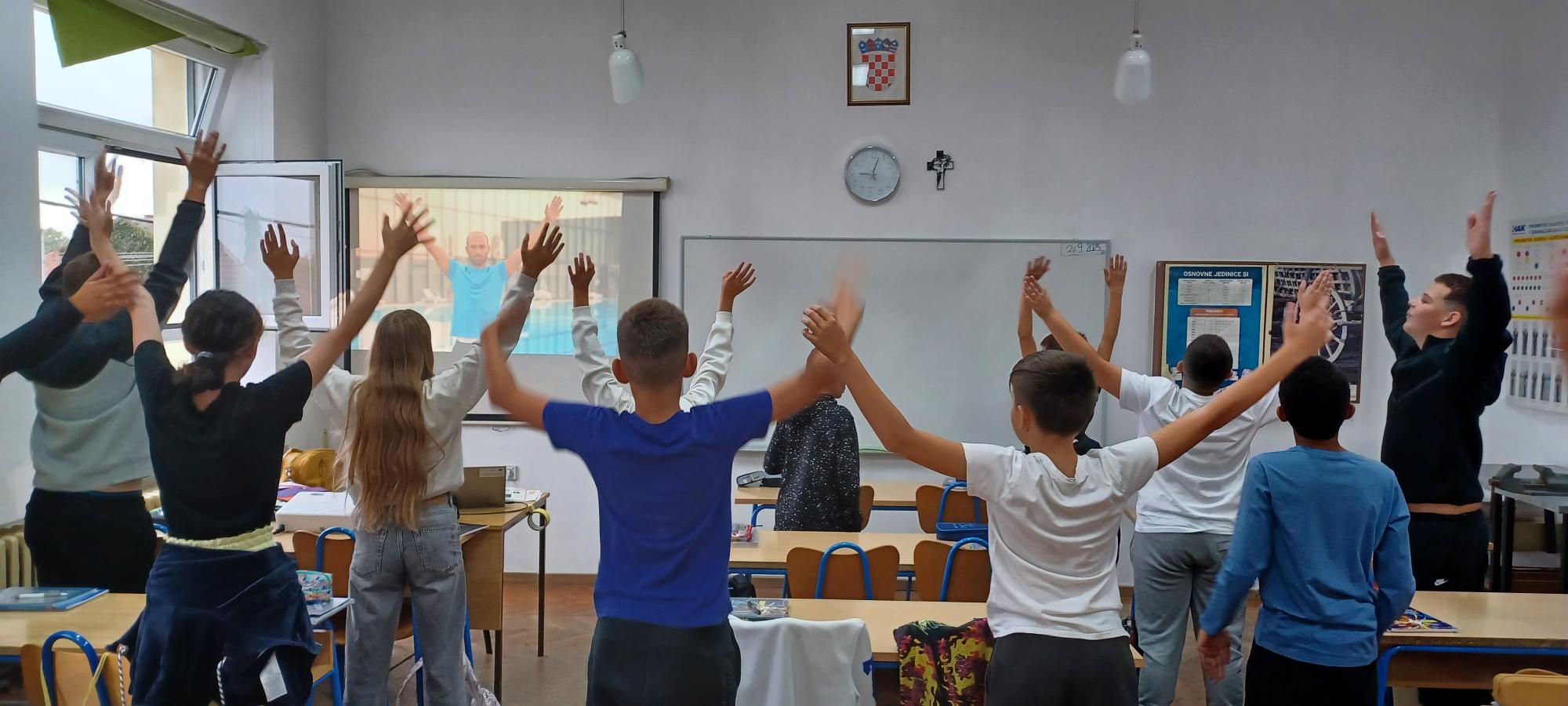 Učenici se ustaju i vježbaju u učionici pokraj svoga radnog stola dok im se puštaju kratki filmovi u kojima poznati brodski sportaši i treneri izvode vježbe pogodne za ovakvu vrstu aktivnosti.