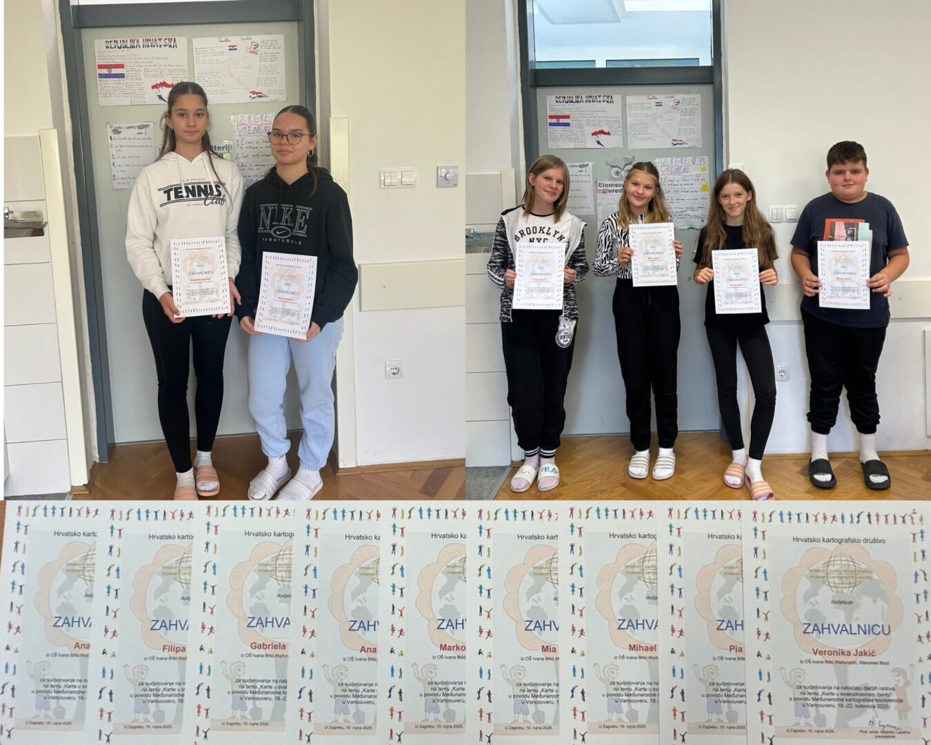Učenici dodatne nastave iz geografije pod mentorstvom učiteljice geografije Magdalene Đaković sudjelovali su na natječaju Hrvatskog kartografskog društva povodom Međunarodne kartografske konferencije. Tema natječaja je bila Karte u svakodnevnom životu. Ciljevi natječaja su poticanje dječjeg kreativnog prikazivanja svijeta kroz grafički izraz, razvoj njihove kartografske percepcije te bolje razumijevanja prostora i okoline. Iako naši radovi nisu odabrani za izložbu u Vancouveru u Kanadi sretni smo da smo sudjelovali i primijenili stečena kartografska znanja. Radujemo se novom kreativnom natječaju.