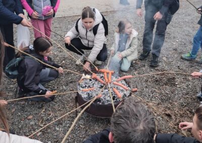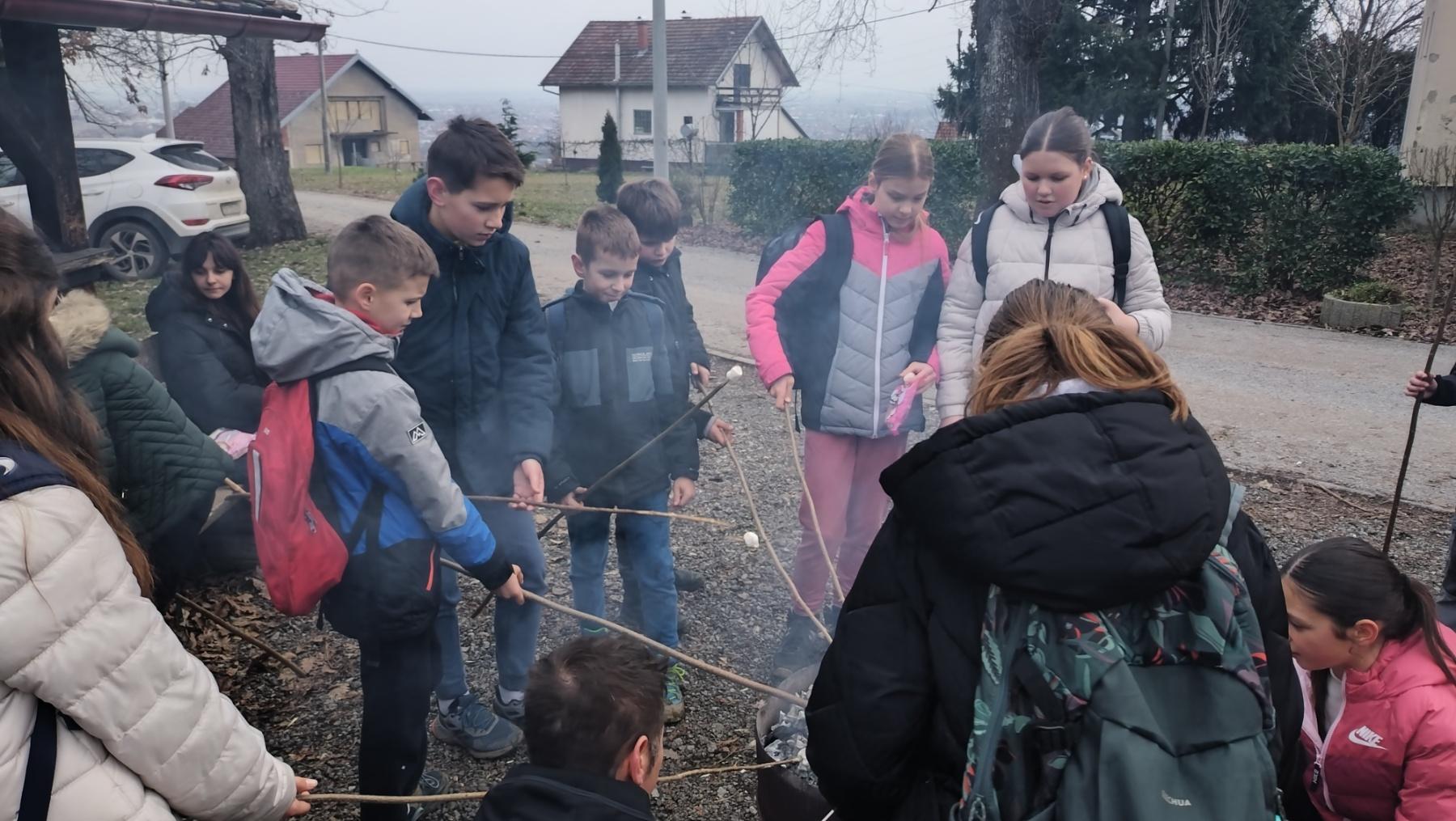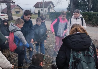 Nakon toga uslijedila je šetnja do Šume Striborove, a po povratku nas je dočekala vatra u pecari i buretu. Grijući se, a pomalo i dimeći, pekli smo na štapovima razne slastice–od kobasica i slanine do sljezovih kolačića.