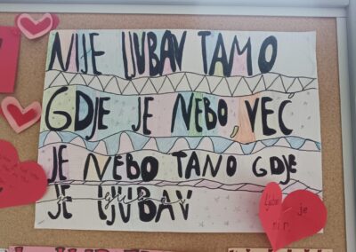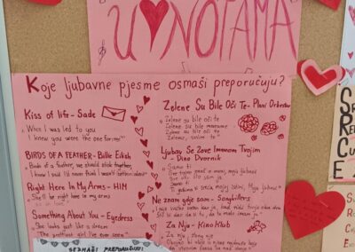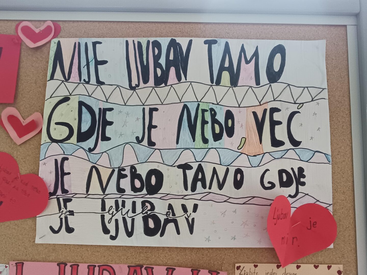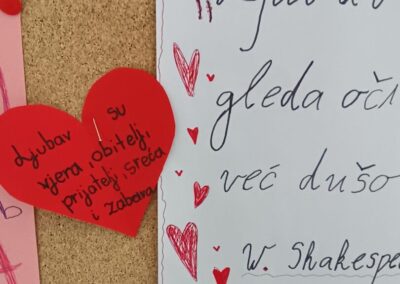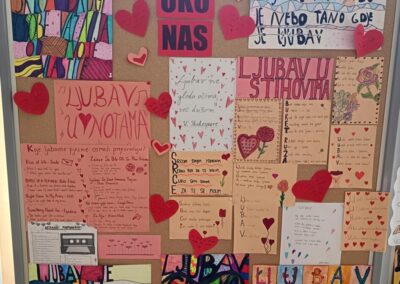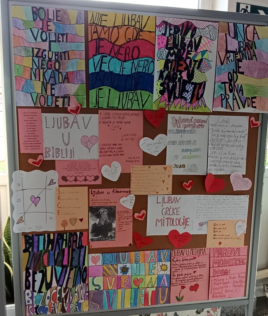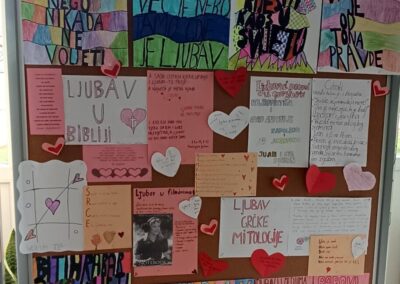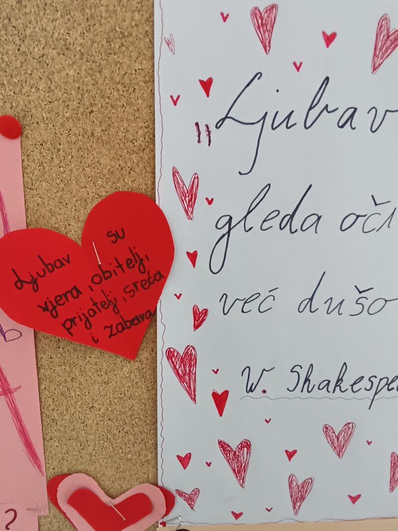 Valentinovo je dan kada iskazujemo ljubav i pažnju svojim voljenima stoga smo u našoj školi odlučili proslaviti Valentinovo. Učenici sedmih i osmih razreda cijeli su se tjedan pripremali za Dan zaljubljenih. Na satima Hrvatskog jezika čitali su i interpretirali lirske pjesme, pronalazili su uglazbljene ljubavne stihove te pisali svoje preporuke najljepših ljubavnih pjesama. Prisjetili su se poznatih povijesnih parova poput Napoelona i Jozefine, Kleopatre i Marka Antonija te drugih. Također su istraživali nesretne ljubavi iz grčke mitologije, a upoznali su se i s temom ljubavi u Bibliji te čitali Hvalospjev ljubavi. Učenici su također pisali preporuke najboljih ljubavnih filmova, a svoje su istraživanje završili pisanjem ljubavnih pjesma – pisanjem akrostiha. Učenici su bili kreativni i maštoviti te su istraživanjem shvatili da je ljubav svuda oko nas. Svoje radove izložili su u hodnicima škole, a spojili smo likovnu umjestnost i književnost.